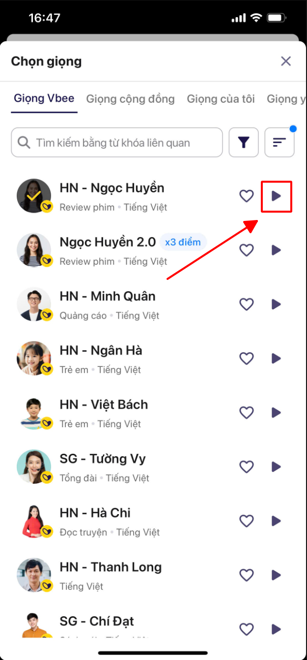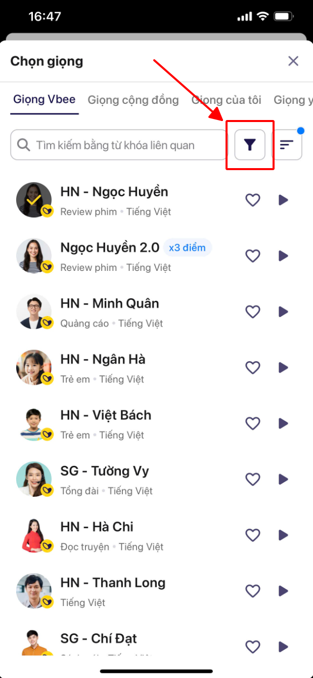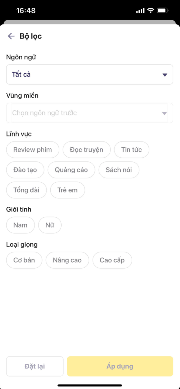 **Bấm vào tìm kiếm giọng đọc phù hợp với nhu cầu sử dụng:** Giới tính, Loại giọng, Ngôn ngữ...