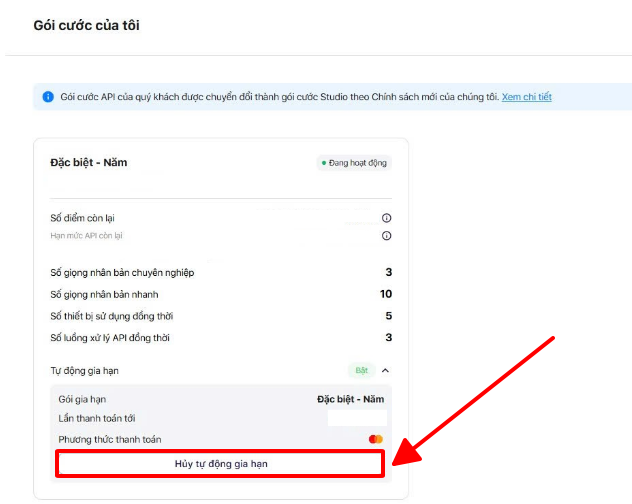 Sau khi hủy tính năng gia hạn tự  động, nếu muốn bật lại tính năng tự động gia hạn, người dùng tiếp tục truy cập mục **Gói cước của tôi** và chọn **Bật tự động gia hạn**. Sau đó người dùng cần nhập lại thông tin thẻ để xác thực nguồn tiền thanh toán khi hệ thống gia hạn tự động.