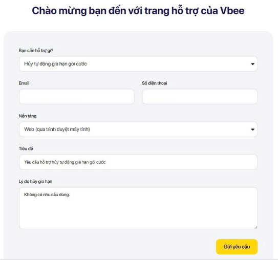 Sau đó hệ thống sẽ hiện thị trang hỗ trợ, vui lòng điền bổ sung các thông tin bap gồm Email tài khoản, Số điện thoại (nhân viên hỗ trợ sẽ gọi điện/liên hệ qua zalo xác nhận thông tin trước khi tiến hành hủy gia hạn), Lý do hủy gia hạn. Sau đó bấm **Gửi yêu cầu**.<br>