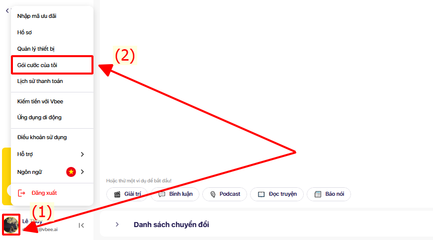 Để hủy tính năng tự động gia hạn, Truy cập mục **Gói cước của tôi** bằng cách bấm vào **Avatar** ở góc màn hình.